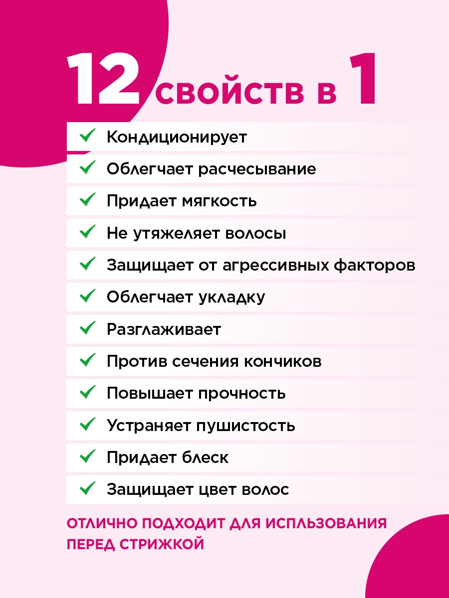 Применение: Тщательно встряхнуть флакон для смешивания двух фаз. Распылить на влажные волосы. Не смывать.