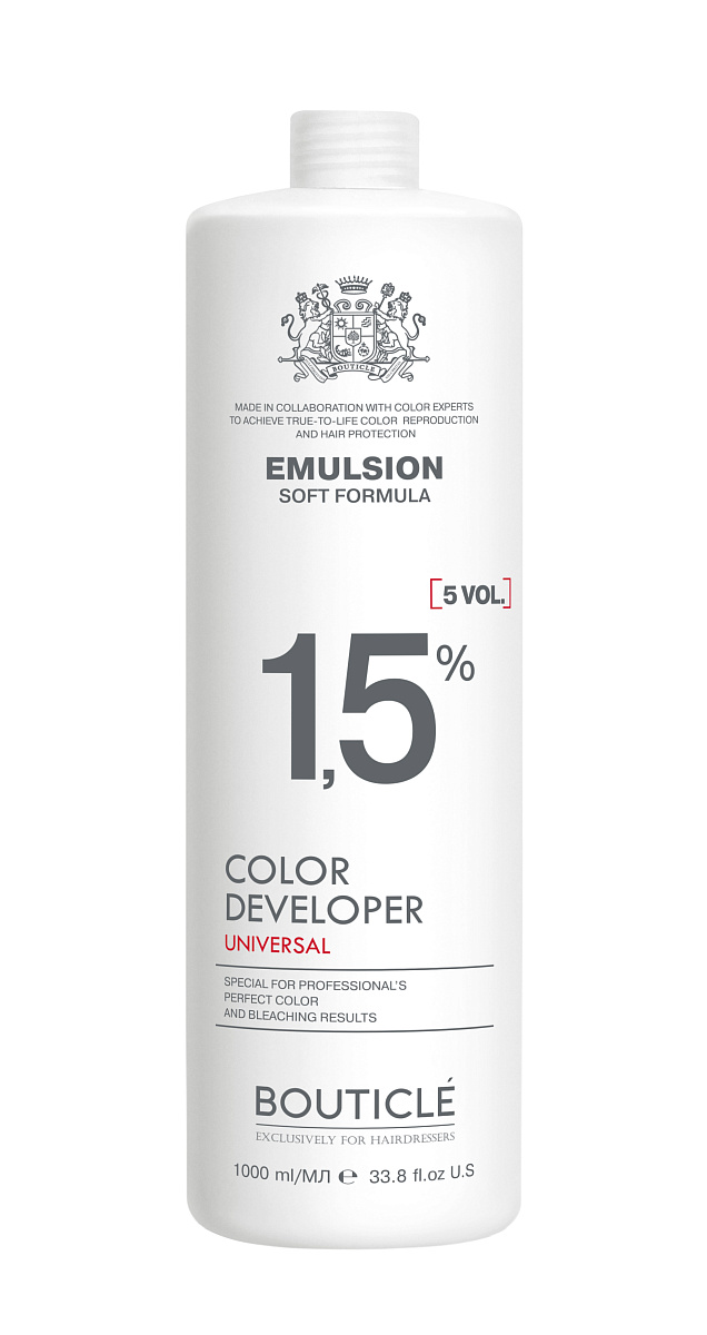 10 vol (3%), 20 vol. (6%), 30 vol. (9%), 40 vol. (12%). Мягкая формула окисляющей эмульсии обладает защитным и смягчающим действием, деликатно ухаживая за кожей головы и волосами в процессе окрашивания, осветления и обесцвечивания. Предназначена для использования с профессиональными красителями и обесцвечивающими средствами бренда BOUTICLÉ. Оказывает увлажняющий эффект.
