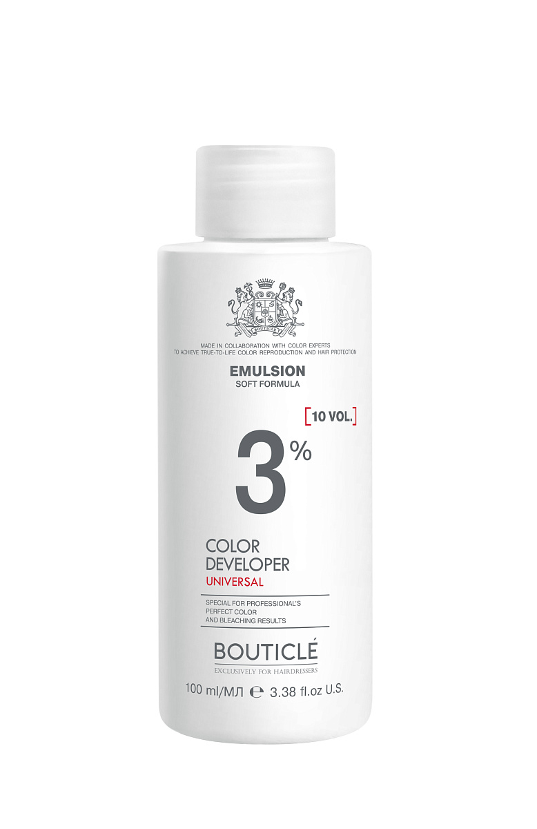 10 vol (3%), 20 vol. (6%), 30 vol. (9%), 40 vol. (12%). Мягкая формула окисляющей эмульсии обладает защитным и смягчающим действием, деликатно ухаживая за кожей головы и волосами в процессе окрашивания, осветления и обесцвечивания. Предназначена для использования с профессиональными красителями и обесцвечивающими средствами бренда BOUTICLÉ. Оказывает увлажняющий эффект.