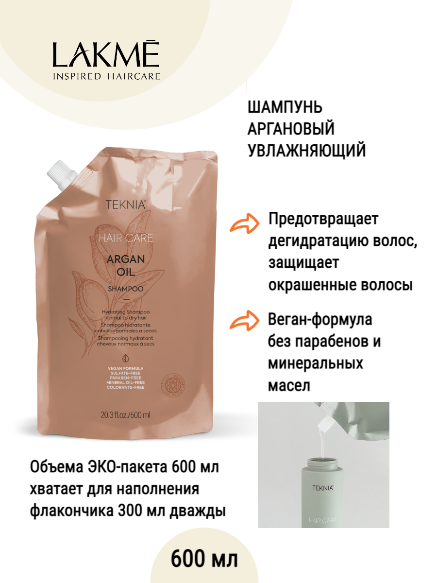 Аргановый профессиональный увлажняющий шампунь для нормальных и сухих волос без сульфатов. Бренд Lakme - производство Испания. От официального дистрибьютора Lakme. Только оригинальные средства. Гарантия качества. Обеспечивает высокий уровень питания волос. Бережно питает и наполняет сухие, поврежденные и ослабленные волосы, сохраняет цвет окрашенным волосам, способствует восстановлению кутикулы волоса. Благодаря чистому органическому аргановому маслу из Марокко и органическому бетаину предотвращает обезвоживание волос, защищает окрашенные волосы, деликатно ухаживает за волосами и облегчает распутывание. Результат: легкие шелковистые волосы с естественным блеском. Ухаживает за кончиками волос и разглаживает их. Его можно использовать после кератинового выпрямления или после процедуры ботокс для волос. Подходит для ежедневного применения. Не содержит сульфатов, парабенов, красителей, минеральных масел и продуктов животного происхождения.