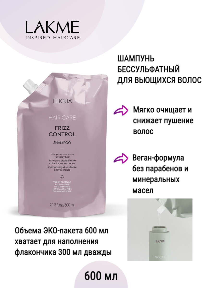 Шампунь бессульфатный Lakme Teknia Frizz Control, арт. 44449, для непослушных или вьющихся волос, 600мл