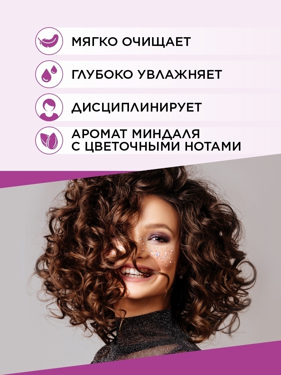 Входящие в состав активные ингредиенты нежно очищают и увлажняют волосы. Гидролизат пшеничного белка и пантенол восстанавливают мягкость непослушных, вьющихся или объемных волос.