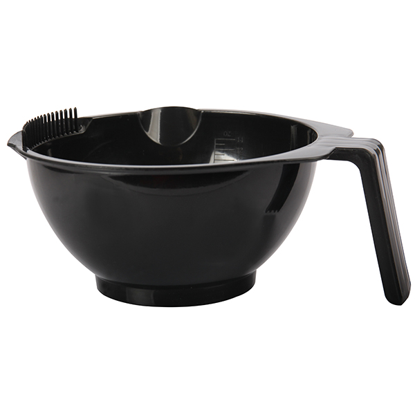 Парикмахерская чаша с ручкой для смешивания краски. Чаша имеет мерную шкалу на 450 мл и резиновую вставку на дне против скольжения. Пластиковые зубчики на ободке чаши позволяют удалить излишки краски с кисточки.