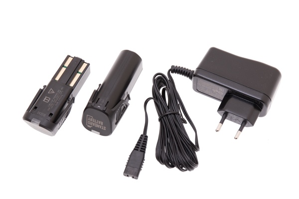 Прилагаются 2 сменных Li-lon аккумулятора, каждый из которых обладает энергоемкостью, достаточной для непрерывной работы в течение 75 минут. Функция быстрой зарядки позволяет произвести подзарядку аккумуляторов за 50 минут, а специальный индикатор - отследить степень заряженности батареи.