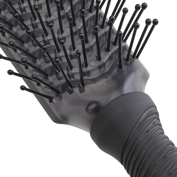 Щётка с пластиковым основанием и щетиной из термостойкого нейлона. Удобная прорезиненная ручка с насечками идеально захватывает волосы и приподнимает их у корней.