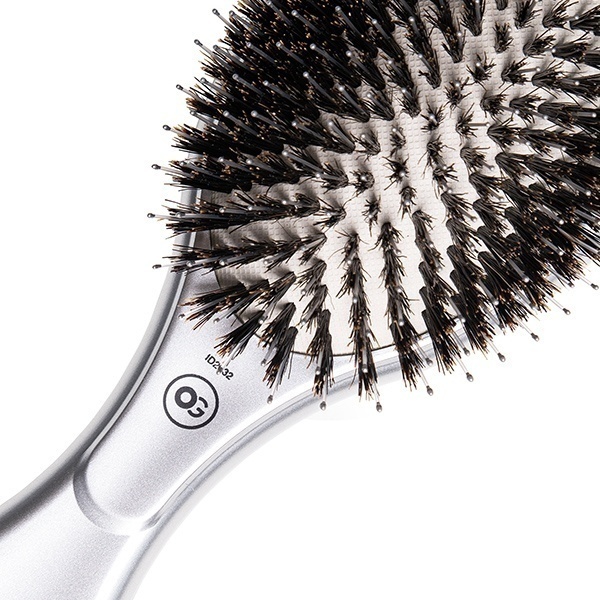 Данная модель оснащена комбинированной щетиной из нейлонового материала и натуральной щетины дикого кабана. Резиновый амортизатор щетины способствует деликатному воздействию на волосы и кожу головы и эффективной укладке.